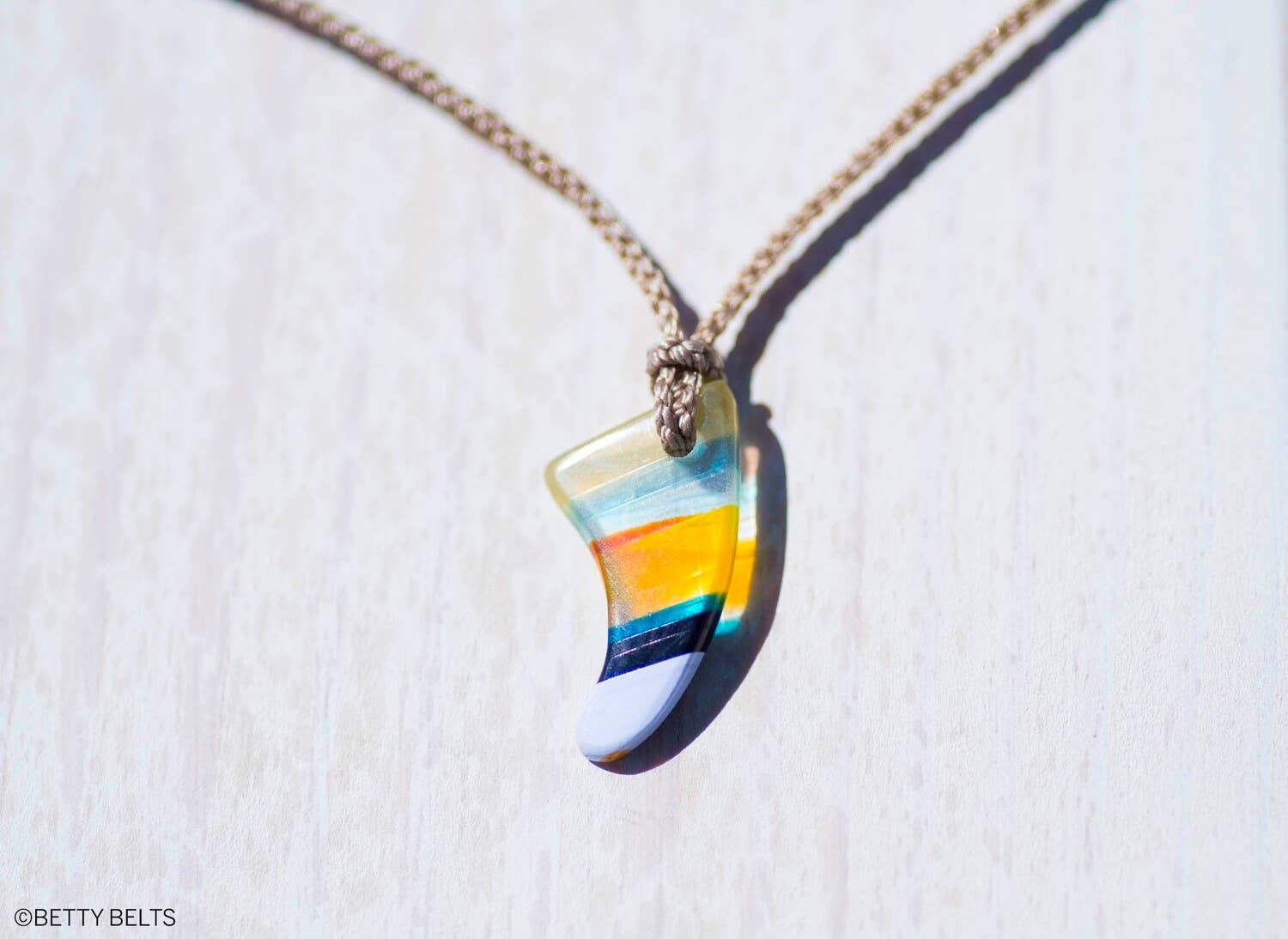 This rad little pretty turns the smallest scrap of surfboard waste into a wearable sun catcher. Never feel far from the surf when you #wearyoursunshine. She's perfect to layer with other Betty necklaces ,or, give her the spotlight worn solo.